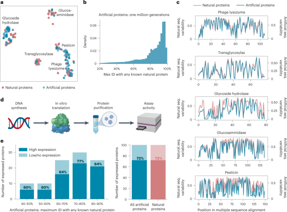 天然蛋白質(zhì)中的一個突變就可以使其停止工作,但在另一輪篩選中,研究小組發(fā)現(xiàn),即使只有 31.4% 的序列與任何已知的天然蛋白質(zhì)相似,AI 生成的酶仍顯示出活性。