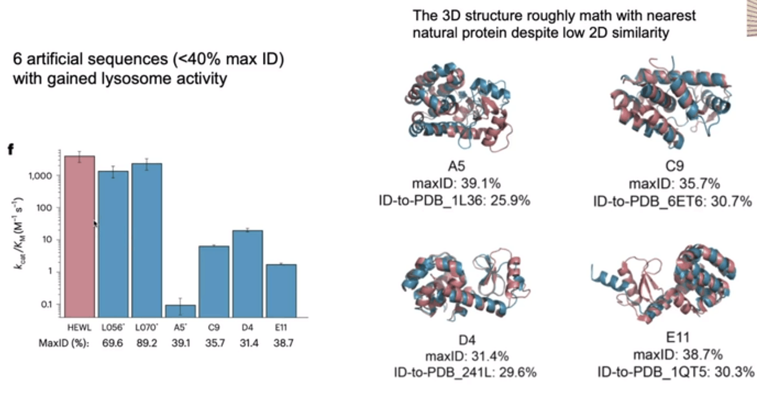 圖 3:人工蛋白質(zhì)序列具有功能,同時與任何已知蛋白質(zhì)的同一性低至 31%,表現(xiàn)出與高度進化的天然蛋白質(zhì)相當(dāng)?shù)拇呋?,并展示與已知天然折疊相似的結(jié)構(gòu)。(來源:論文)