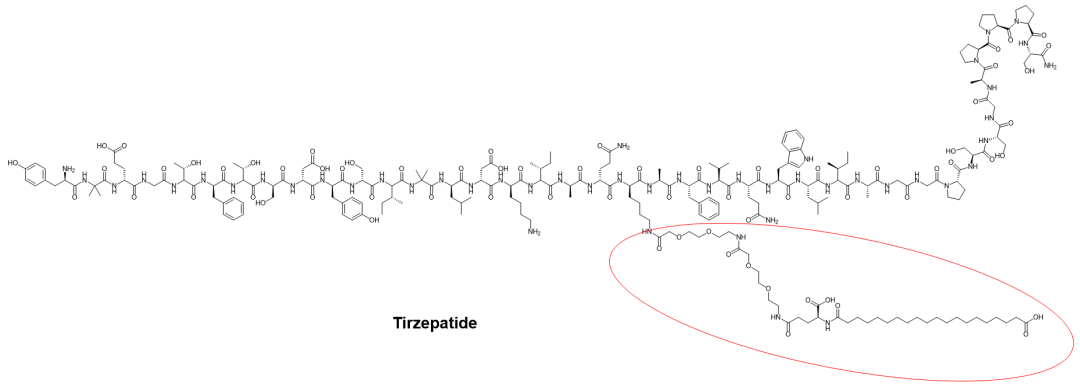 替爾泊肽(Tirzepatide,Mounjaro?)是禮來(lái)的2型糖尿病多肽藥物,是GLP-1/GIP受體共激動(dòng)劑,通過(guò)皮下注射每周給藥一次。替爾泊肽是人類GIP(glucose-dependent insulinotropic peptide, 葡萄糖依賴性促胰島素多肽)的類似物,附有C20脂肪酸二酸部分,用于優(yōu)化化合物的攝取和代謝。脂肪二酸部分(二十烷二酸)通過(guò)谷氨酸和兩個(gè)(2-(2-氨基乙氧基)乙氧基)乙酸單元,連接到賴氨酸殘基的側(cè)鏈(圖4)。這個(gè)脂質(zhì)化修飾產(chǎn)生了更長(zhǎng)的半衰期,并延長(zhǎng)劑量之間的時(shí)間,替爾泊肽的半衰期約為5天。