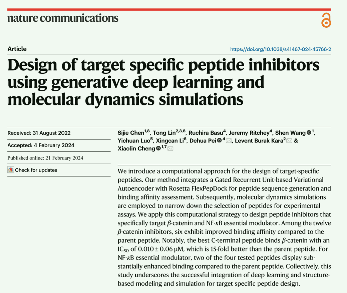 結(jié)論:該研究成功結(jié)合了深度學(xué)習(xí)和基于結(jié)構(gòu)的建模與模擬,為特定靶標(biāo)肽設(shè)計(jì)提供了新的計(jì)算方法,同時(shí)也發(fā)現(xiàn)了針對(duì)β-catenin具有改善結(jié)合能力的肽。