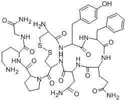 Ornipressin Acetate;1-[19-Amino-13-benzyl-10-(2-carbamoylethyl)-7-(carbamoylmethyl)-16-[(4-hydroxyphenyl)methyl]-6,9,12,15,18-pentaoxo-1,2-dithia-5,8,11,14,17-pentazacycloicosane-4-carbonyl]-N-[4-amino-1-(carbamoylmethylcarbamoyl)butyl]pyrrolidine-2-carboxamide;8-Ornithinevasopressin;Ornipressin;VASOPRESSIN, 8-L-ORNITHINE-;vasopressin 8-ornithine;8-ornipressin vasopressin;POR-8 |